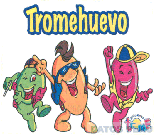 La etiqueta conformada por la denominación TROMEHUEVO escrita en letras características de color amarillo con bordes de color azul; las figuras humanizadas de tres huevos con gorro, camisas y lentes en la combinación de colores verde, morado, fucsia, anaranjado, amarillo, azul, marrón y rojo; la denominación GOLOSINAS TROME escrita en letras características en la combinación de colores azul, fucsia, turquesa y amarillo; conforme al modelo adjunto