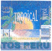 El empaque conformado por la denominación TROPICAL escrita en letras características blancas, con fondo azul, donde se puede apreciar el diseño característico de una palmera y un sol; conforme al modelo adjunto