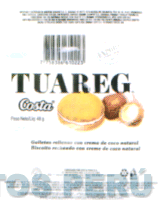LA ENVOLTURA DE FONDO COLOR BLANCO CONTENIENDO LA DENOMINACION TUAREG EN LETRAS COLOR NEGRO Y LA PALABRA COSTA ESCRITA EN MOLDES CARACTERISTICOS COLOR BLANCO CON BORDE COLOR NEGRO, EN LA PARTE CENTRAL SE OBSERVA LA REPRESENTACION DE UNA GALLETA EN COLOR AMARILLO CON RELLENO, COLOR BLANCO Y DOS COCOS EN COLOR MA