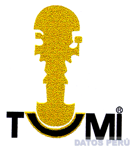 LA DENOMINACION TUMI ESCRITA EN LETRAS ESTILIZADAS DE COLOR NEGRO, DONDE LA LETRA U TIENE BORDE DORADO, Y LA FIGURA DE UN TUMI DE COLOR DORADO; SEGUN MODELO ADJUNTO,