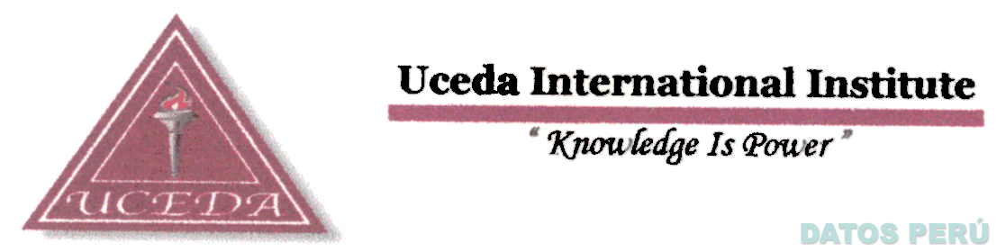 El logotipo conformado por una figura de doble triángulo en cuyo interior se aprecia la figura estilizada de una antorcha encendida y debajo la denominación UCEDA escrita en letras características; al lado derecho se aprecia la denominación UCEDA INTERNATIONAL INSTITUTE escrita en letras características sobre una línea horizontal; debajo la frase "KNOWLEDGE IS POWER" escrita en letras características; todo en los colores granate, blanco, anaranjado y plomo; conforme al modelo adjunto
