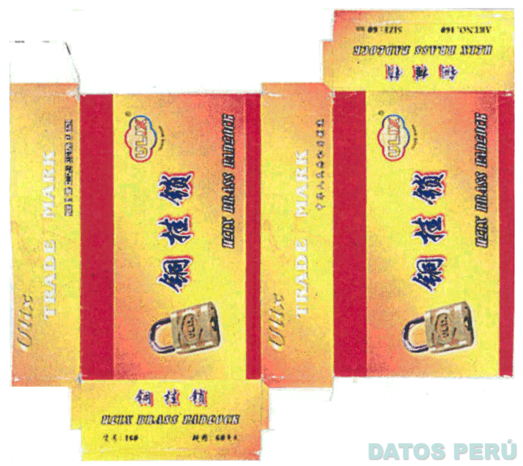 Una caja-empaque de forma rectangular, conteniendo la denominación ULIX escrita en letras características en la parte superior, en el centro la figura de un candado, debajo la denominación ULIX BRASS PADLOCK, y demás caracteres chinos, todo en los colores amarillo, marrón, rojo, azul, anaranjado, blanco y negro; conforme al modelo adjunto