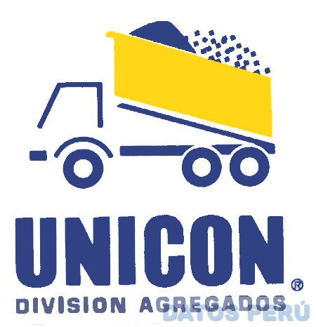 El logotipo conformado por la figura estilizada de un camión cuya tolva o cajón se encuentra inclinada, en la parte inferior, la denominación UNICON escrita en letras características grandes, debajo de la cual aparece la frase DIVISION AGREGADOS, en la combinación de colores azul y amarillo, conforme al modelo adjunto