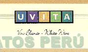La etiqueta rectangular conteniendo la denominación UVITA escrita en letras características, donde cada una de las letras de dicha denominación están ubicadas dentro de un cuadrado, debajo, la denominación VINO BLANCO-WHITE WINE escrita en letras características, en los colores azul, morado, dorado, verde; dorado y amarillo; conforme al modelo adjunto