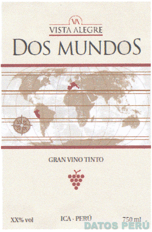 La denominación VA VISTA ALEGRE DOS MUNDOS GRAN VINO TINTO ICA-PERÚ y logotipo (se reivindica colores), conforme al modelo