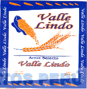 El logotipo conformado por la denominación VALLE LINDO escrita en letras características, al lado izquierdo se aprecia una figura que se asemeja a un sombrero conteniendo granos, debajo la representación de tres espigas; en la parte inferior la frase ARROZ SELECTO VALLE LINDO escrita en letras características, todo dentro de una figura cuadrangular, y sobre la parte superior e inferior de dicha figura se aprecian diversos diseños irregulares y a los lados y en forma repetitiva la denominación VALLE LINDO; y demás leyendas alusivas al producto; todo en los colores anaranjado, azul y blanco; conforme al modelo adjunto