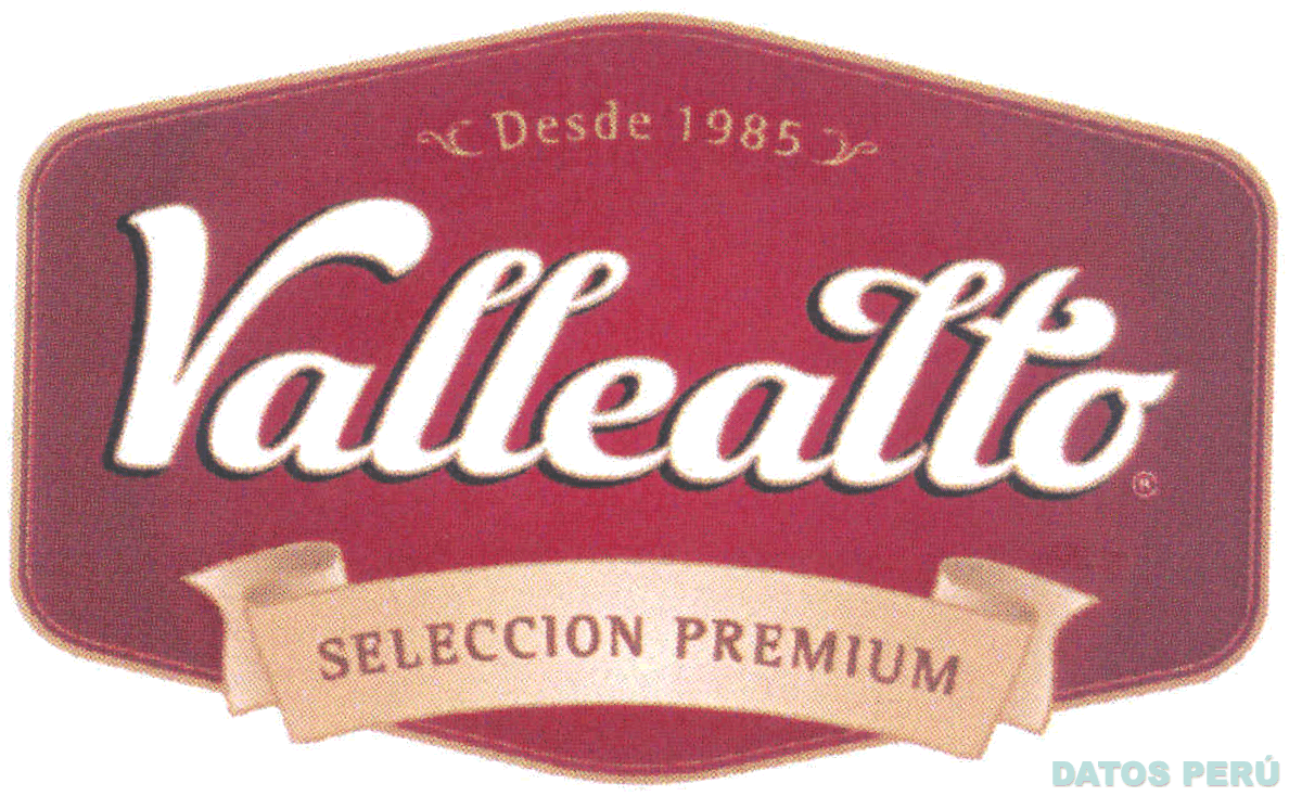 El logotipo conformado por una figura irregular en cuyo interior se aprecia la denominación VALLEALTO escrita en letras características y en la parte superior la frase DESDE 1985 (sin reivindicar), a cuyos extremos se aprecian figuras irregulares, asimismo en la parte inferior una cinta con la frase SELECCIÓN PREMIUM (sin reivindicar), ambas escritas en letras características, todo en colores negro, granate en distintas tonalidades, blanco, marrón y dorado; conforme al modelo adjunto