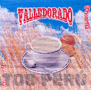 El logotipo conformado por las denominaciones VALLEDORADO escritas en letras características y la figura de una taza, un plato, dos piezas de pan y una cuchara, todo sobre un campo de cebada y un cielo con nubes, en la combinación de colores azul, blanco, gris, amarillo, anaranjado, marrón y rojo; conforme al modelo adjunto