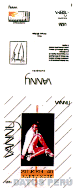 LA DENOMINACION VANNY Y ENVOLTURA DE FORMA RECTANGULAR QUE CONTIENE EN LA PARTE DELANTERA LA FIGURA DE UNA MUJER, EN LA PARTE INFERIOR LA DENOMINACION SILKEN 40 PANTY HOSE; EN LA PARTE SUPERIOR LA FRASE HITEPIMA Y FIGURA ESTILIZADA DE UN COPO DE ALGODON CUYO TALLO CONSTITUYE LA LETRA I; ASIMISMO EN LA PARTE SUPERIOR DEL FACSIMIL SE APRECIA UNA SERIE DE LEYENDAS ALUSIVAS AL PRODUCTO, TODO EN LOS COLORES BLANCO, NEGRO, MOSTAZA Y VERDE; CONFORME AL MODELO ADJUNTO,