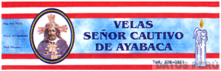 EL LOGOTIPO CONFORMADO POR LA DENOMINACION VELAS SEÑOR CAUTIVO DE AYABACA ESCRITA EN LETRAS CARACTERISTICAS, AL EXTREMO IZQUIERDO LA IMAGEN DEL SEÑOR CAUTIVO DE AYABACA, DENTRO DE UN OVALO, AL EXTREMO DERECHO LA FIGURA ESTILIZADA DE UNA VELA ENCENDIDA, Y LOS EXTREMOS SUPERIOR E INFERIOR REPRESENTADOS POR DOS FRANJAS, TODO EN LA COMBINACION DE COLORES MORADO, ROJO, BLANCO, CELESTE Y AMARILLO, CONFORME AL MODELO ADJUNTO