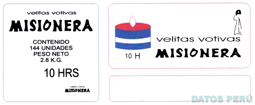 La etiqueta dividida en dos campos, el de la izquierda formado por un recuadro de color azul y fondo blanco conteniendo la denominación VELITAS VOTIVAS MISIONERA escrita en letras características, el de la izquierda se encuentra a su vez dividido en dos campos formados por dos recuadros en color rojo y fondo blanco, arriba uno grande conteniendo la representación de una vela votiva en rojo y azul, la denominación VELITAS VOTIVAS MISIONERA escrita en letras características y la figura de una religiosa, y debajo un recuadro pequeño sin elementos en su interior; conforme al modelo adjunto