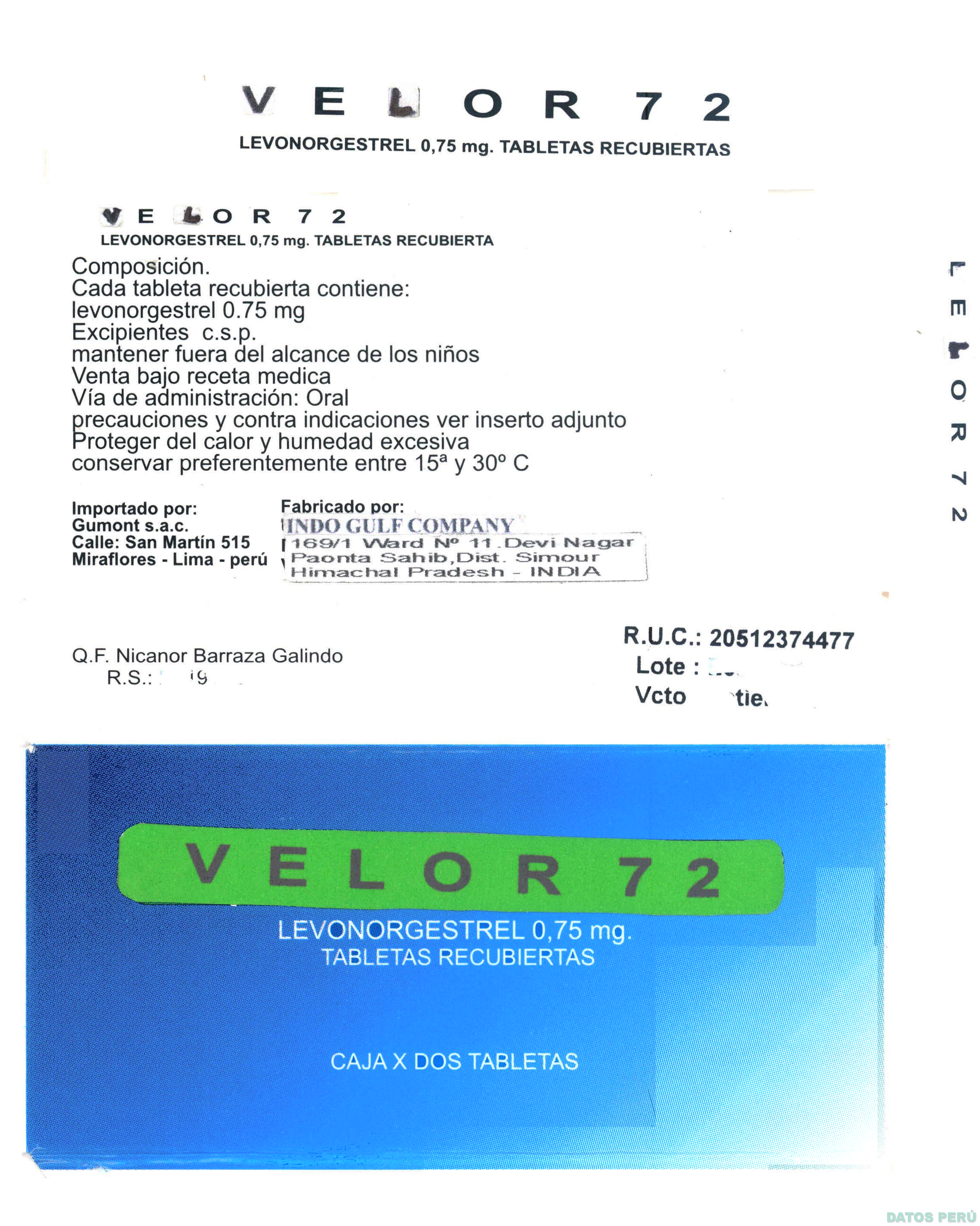 El logotipo conformado por la denominación VELOR 72 escrita en letras características sobre una figura rectangular con las puntas redondeadas y, ésta a su vez sobre una figura rectangular, asimismo se aprecian frases alusivas al producto, sin reivindicar, todo en la combinación de colores negro, verde, blanco y azul en degradé; conforme al modelo adjunto
