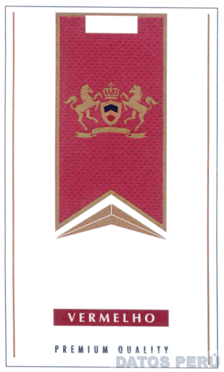 LA ETIQUETA RECTANGULAR DE FONDO BLANCO, CONFORMADA POR LA FIGURA DE DOS CABALLOS RAMPANTES DE COLOR DORADO A LOS COSTADOS DE UN ESCUDO DE COLOR DORADO, NEGRO Y GUINDA, DENTRO DE UN RECUADRO DE COLOR GUINDA CON BORDES DORADO, DEBAJO LA DENOMINACIÓN VERMELHO CON LETRAS DE COLOR BLANCO DENTRO DE UN RECTÁNGULO DE FONDO GUINDA, Y LA DENOMINACIÓN PREMIUM QUALITY DE COLOR NEGRO, CONFORME AL MODELO ADJUNTO