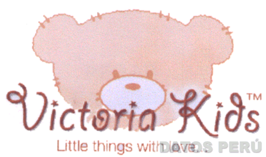 EL LOGOTIPO CONSTITUIDO POR LA DENOMINACION VICTORIA KIDS ESCRITO EN LETRAS ESTILIZADAS, Y EL TEXTO EN INGLES LITTLE THINGS WITH LOVE..., TODO ESCRITO ENCIMA DEL DIBUJO ESTILIZADO DEL ROSTRO DE UN OSO EN COLOR MARRON CLARO, ROSADO Y CELESTE, SEGUN MODELO ADJUNTO