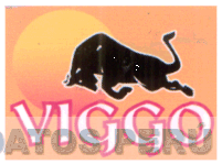 La denominación VIGGO en letras blancas con borde rojo y figura de un toro negro sobre un sol, en tono anaranjado y amarillo en degrade, conforme al modelo