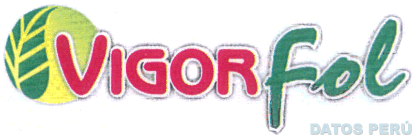 El logotipo conformado por la denominación VIGORFOL escrita en letras características, en la letra V se aprecia un círculo conteniendo además la representación de una hoja; en colores rojo, verde y amarillo, conforme al modelo adjunto