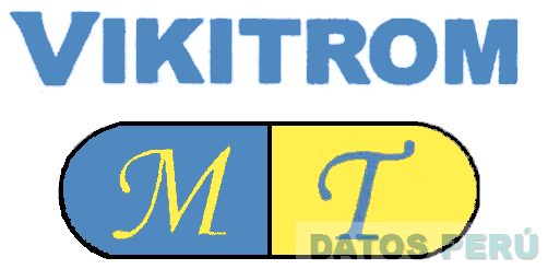 La denominación VIKITROM escrita en letras características, debajo dentro de una figura que se asemeja a una cápsula se aprecian las letras M y T en los colores azul, amarillo y negro; conforme al modelo adjunto
