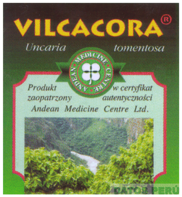 LA ETIQUETA QUE EN LA PARTE SUPERIOR LLEVA LA DENOMINACION VILCACORA SOBRE UN FONDO OSCURO, DEBAJO DE DICHA DENOMINACION APARECEN DATOS REFERENTES AL PRODUCTO; EN LA PARTE CENTRAL LLEVA UN ESCUDO CIRCULAR CARACTERISTICO QUE CONTIENE LA FIGURA DE UN TREBOL DE CUATRO HOJAS CON LA DENOMINACION ANDEAN MEDICINE CENTRE; EN LA PARTE INFERIOR DENTRO DE UN RECUADRO VAN LAS INDICACIONES DEL PRODUCTO Y LA FIGURA DE UN PAISAJE SELVATICO; EN SUS COLORES NEGRO, VERDE, ROJO, MARRON, AMARILLO Y BLANCO; CONFORME AL MODELO ADJUNTO,