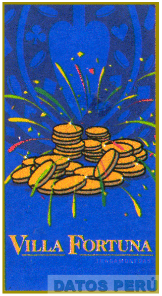 LA DENOMINACION VILLA FORTUNA ESCRITA EN LETRAS CARACTERISTICAS DENTRO DE UNA FIGURA RECTANGULAR VERTICAL EN COLOR AZUL CON BORDE DORADO QUE EN SU INTERIOR CONTIENE MONEDAS, FUEGOS ARTIFICIALES Y MOTIVOS DE AZAR, EN LOS COLORES AMARILLO, ROJO Y VERDE, CONFORME AL MODELO ADJUNTO