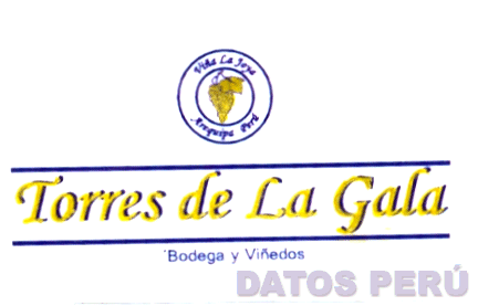 El logotipo conformado por la denominación TORRES DE LA GALA escrita en letras características dentro de dos líneas paralelas horizontales, arriba se aprecian dos círculos conteniendo la denominación VIÑA LA JOYA AREQUIPA PERÚ y en el centro lleva la figura de un racimo de uvas, abajo aparece la denominación BODEGA Y VIÑEDOS; todo en colores dorado y azul, conforme al modelo adjunto