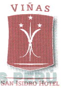 El logotipo conformado por la denominación VIÑAS SAN ISIDRO HOTEL escrita en letras características y la representación estilizada de una flor de liz de doble punta coronada por tres estrellas y una raya horizontal debajo, encerrada en una figura estilo escudo de armas y con la combinación de colores granate y blanco; conforme al modelo adjunto