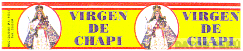 LA ETIQUETA RECTANGULAR DE FONDO AMARILLO QUE CONTIENE LA DENOMINACION VIRGEN DE CHAPI EN FORMA REPETIDA EN COLOR AZUL, ASI COMO SU FIGURA CON MARCO OVALADO DE COLOR ROJO SOBRE UN FONDO BLANCO; LOS BORDES ESTAN CONFORMADOS POR FRANJAS DE COLOR ROJO Y BLANCO; CONFORME AL MODELO ADJUNTO