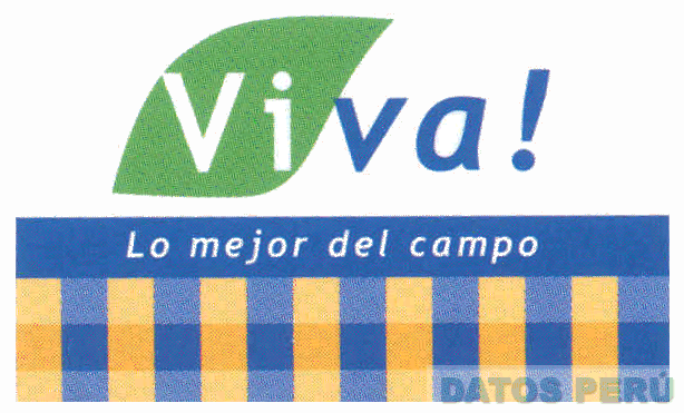 El logotipo conformado por la denominación VIVA! escrita en letras características debajo de la partícula VI se aprecia una figura irregular seguida de una franja horizontal dentro de la cual se aprecia la frase LO MEJOR DEL CAMPO escrita en letras características y en la parte inferior se verifican franjas horizontales y verticales que forman cuadrados, todo en la combinación de colores verde, azul y amarillo; conforme al modelo adjunto