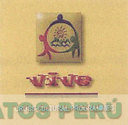 El logotipo conformado por la denominación VIVE CROSS-CULTURAL PROGRAMMES escrita en letras características, donde VIVE es de color rojo, bajo ella una línea horizontal de color rojo y la denominación CROSS-CULTURAL PROGRAMMES en letras de color blanco, en la parte superior un cuadrado de color dorado dentro del cual se aprecia la figura estilizada de tres personas tomadas de la mano formando un circulo y un paisaje que incluye el sol de color amarillo sobre montañas de color verde, sin revindicar el color amarillo del fondo, conforme al modelo adjunto