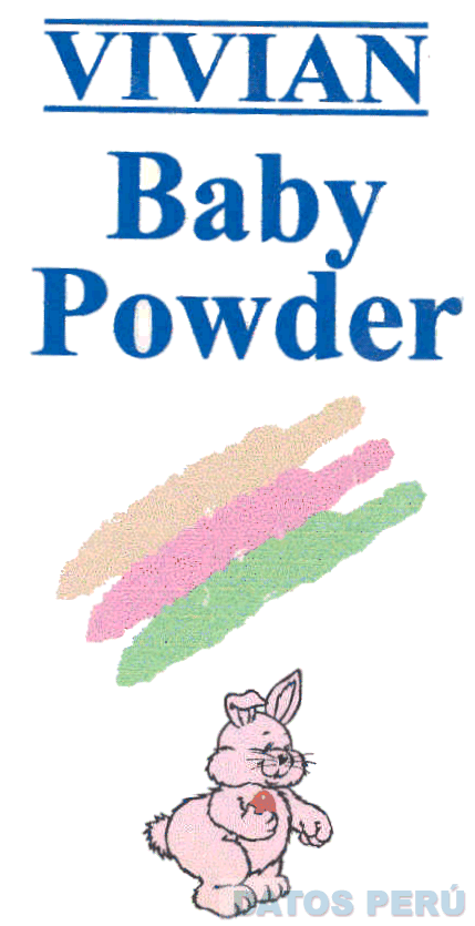 LA DENOMINACION VIVIAN BABY POWDER ESCRITA EN LETRAS CARACTERISTICAS, LA REPRESENTACION ESTILIZADA DE UN CONEJO COGIENDO UN CORAZON, Y TRES FRANJAS, TODO EN LOS COLORES AZUL, ROSADO, ROJO, VERDE Y KAQUI; CONFORME AL MODELO ADJUNTO