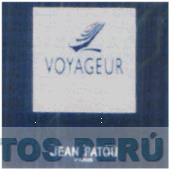La etiqueta que contiene la denominación VOYAGEUR en azul marino y el diseño de un barco en azul marino y rojo y la marca JEAN PATOU en plateado, conforme al facsímil