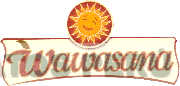 La denominación WAWASANA escrita en letras características dentro de una figura rectangular con tres lados ondeados, en la parte superior se aprecia una figura circular conteniendo la representación estilizada de un sol sonriente, en los colores dorado, granate y crema; conforme al modelo adjunto