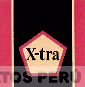 El logotipo conformado por la denominación X-TRA escrita en letras características, dentro de una figura pentagonal y a los lados dos franjas verticales de diferentes tamaños, todo en los colores rojo, amarillo y negro; conforme al modelo adjunto