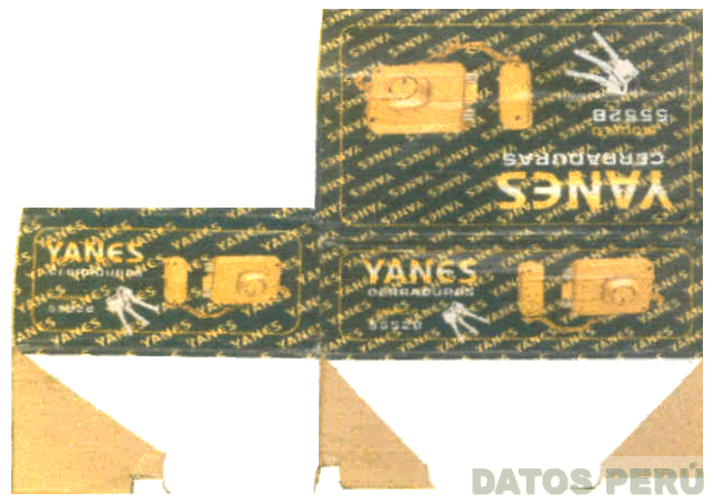 EL EMPAQUE CONFORMADO POR LA DENOMINACIÓN YANES ESCRITA EN LETRAS CARACTERÍSTICAS TANTO EN LA CARA PRINCIPAL COMO EN LA PARTE LATERAL Y LA REPRESENTACIÓN DE UNA CHAPA Y SUS RESPECTIVAS LLAVES, TODO EN LOS COLORES NEGRO, AMARILLO, PLOMO Y BLANCO; CONFORME AL MODELO ADJUNTO