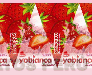 El logotipo conformado por el empaque rectangular que en su interior presenta dos triángulos y la mitad de otro triángulo posicionados en a base en forma horizontal y continua, cada triángulo de color blanco conformado en la parte inferior central por la denominación YOBIANCA escrita en letras características de color rojo y arriba, en la parte superior izquierda la figura de un corazón inclinado y en su interior la denominación BIANCA escrita en letras características de color blanco, superior a ello, en la parte central del triángulo se observa la representación estilizada de una rodaja de fresa y una fresa entera sobre una figura irregular que asemeja a un líquido rosado salpicado, se observan frases alusivas al producto sin reivindicar, todo de color rojo y blanco, todos los triángulos están sobrepuestos a un fondo que contienen figuras de fresas enteras colocadas en forma conjunta de color rojo con puntos amarillos y sobre las fresas hojas de color verde; conforme al modelo adjunto