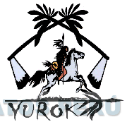 El logotipo conformado por la denominación YUROK escrita en letras características y el diseño de dos hachas cruzadas dentro de la figura de un caballo con un jinete, debajo el diseño de una lanza; en colores negro, plomo, anaranjado y amarillo; conforme al modelo adjunto