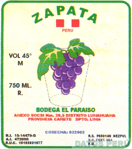 LA ETIQUETA CONFORMADA POR LA DENOMINACION ZAPATA ESCRITA EN LETRAS CARACTERISTICAS, LA FIGURA ESTILIZADA DE UN RACIMO DE UVA DENTRO DE UN VASO TRANSPARENTE, Y LA FIGURA DE LA BANDERA PERUANA CON LA DENOMINACION PERU CARACTERISTICA, TODO EN LA COMBINACION DE COLORES VERDE, MORADO, ROJO, BLANCO, NEGRO Y MARFIL; CONFORME AL MODELO ADJUNTO