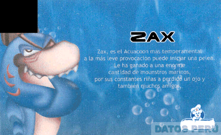 La denominación ZAX escrita en letras características, las figuras de un tiburón y un oso estilizados, y demás frases sin reivindicar, en colores celeste, azul, gris, blanco, rojo, rosado, negro y marrón; conforme al modelo adjunto