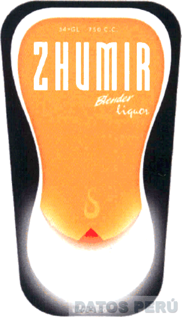 La denominación ZHUMIR BLENDER LIQUOR escrita en letras características de color blanco, dentro de una figura irregular en los colores anaranjado y blanco, que contiene a su vez una pequeña flama de color anaranjado y un triángulo de color rojo, todo ello sobre un fondo de color negro; conforme al modelo adjunto