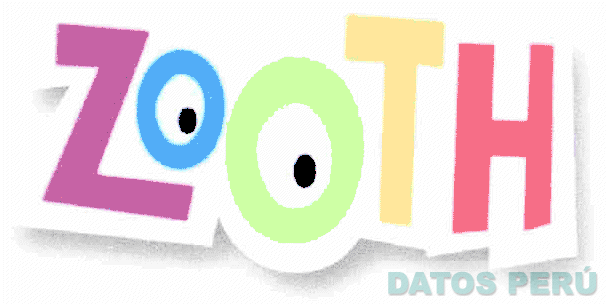 El logotipo conformado por la denominación ZOOTH escrita en letras características bordeada de blanco sobre una sombra difuminada gris, las letras O tienen un punto negro en el centro para simular ojos; todo en la combinación de colores blanco, gris, morado, turquesa, verde, amarillo, rojo y negro; conforme al modelo adjunto